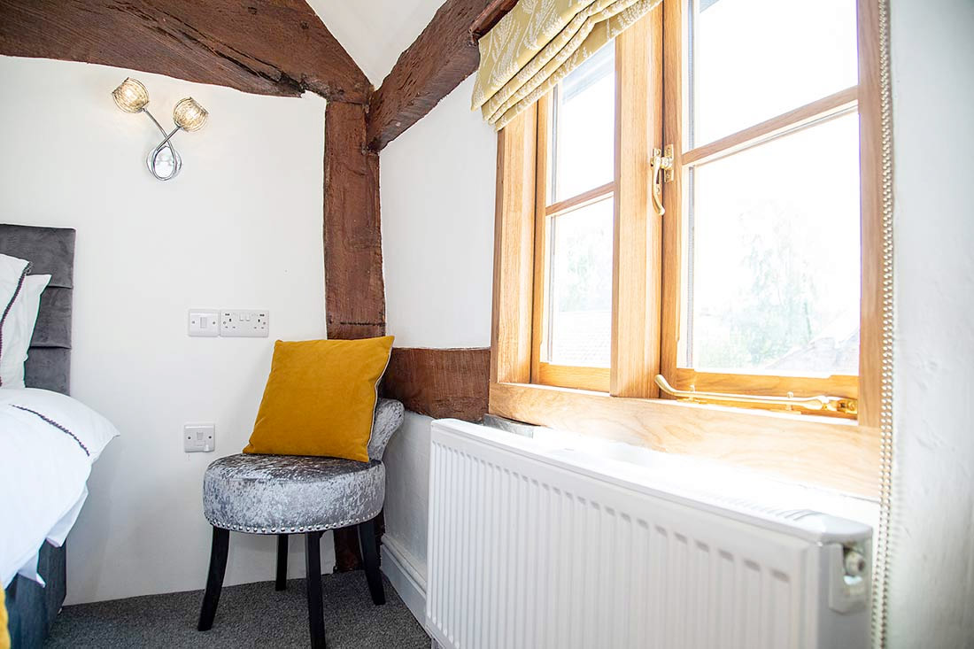 Our twin room with en-suite shower room and feature beams. The room was once the owners personal kitchen.